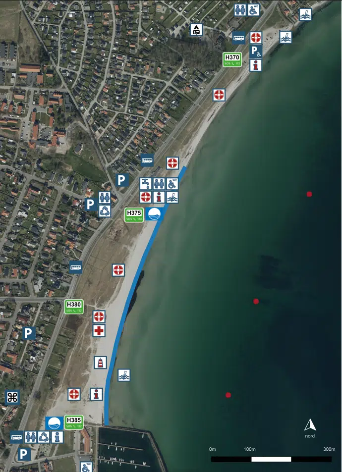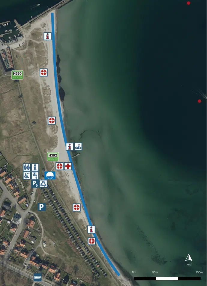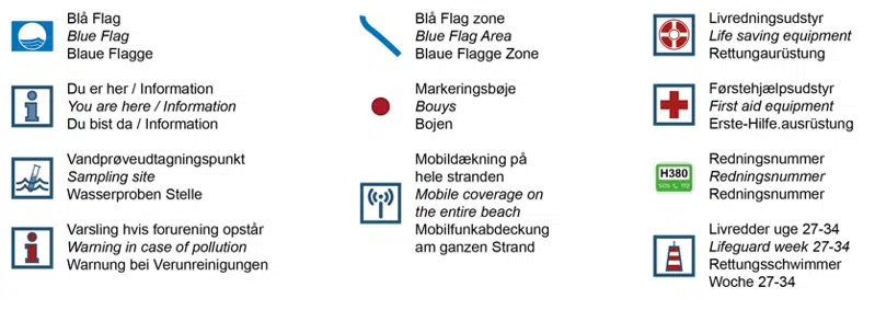 Blå flag zonen omfatter hele Sydstranden samt den sydligste del af Nordstranden: