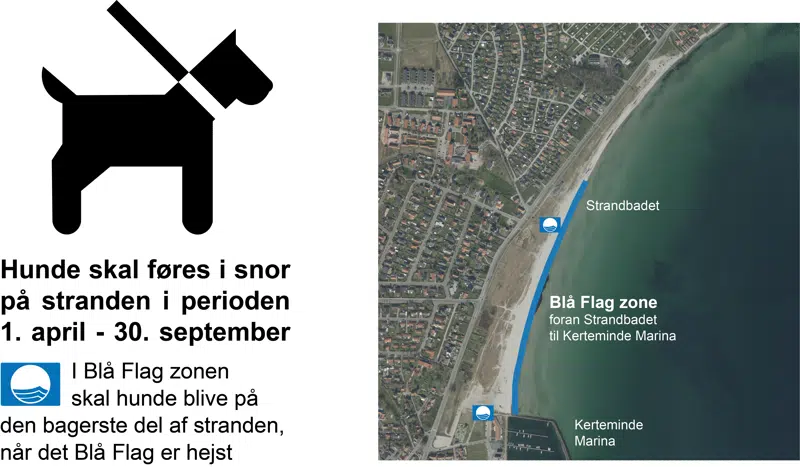 For Blå Flag-strande gælder desuden, at hvis det Blå Flag er hejst, skal hunden blive på den bagerste del af stranden i Blå flag zonen.