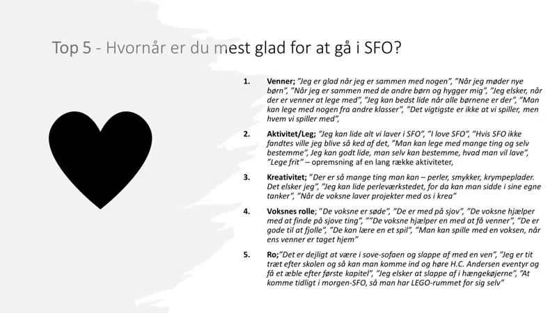- ”Alle andre steder blander voksne sig alt for meget i børns liv og leg. Her kan SFO noget særligt. Man lærer, at agere med andre børn og ikke den kunstige sociale læring, der kommer ud af for megen leg med voksne”