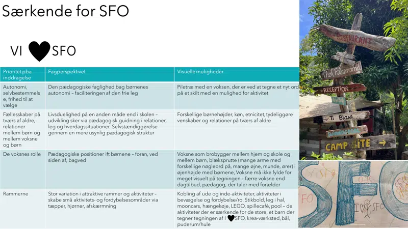 Vi har lyttet til børn, forældre og medarbejdere for at forstå, hvad der gør vores SFO'er unikke. De har beskrevet og sat billede på den praksis, der er en stor del af børnenes hverdag.